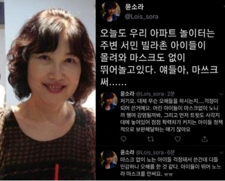 유명 성우 윤소라(60)씨가 마스크를 쓰지 않고 자신이 사는 아파트 놀이터에서 노는 아이들을 가리켜 ‘주변 서민 빌라촌 아이들’이라고 표현해..